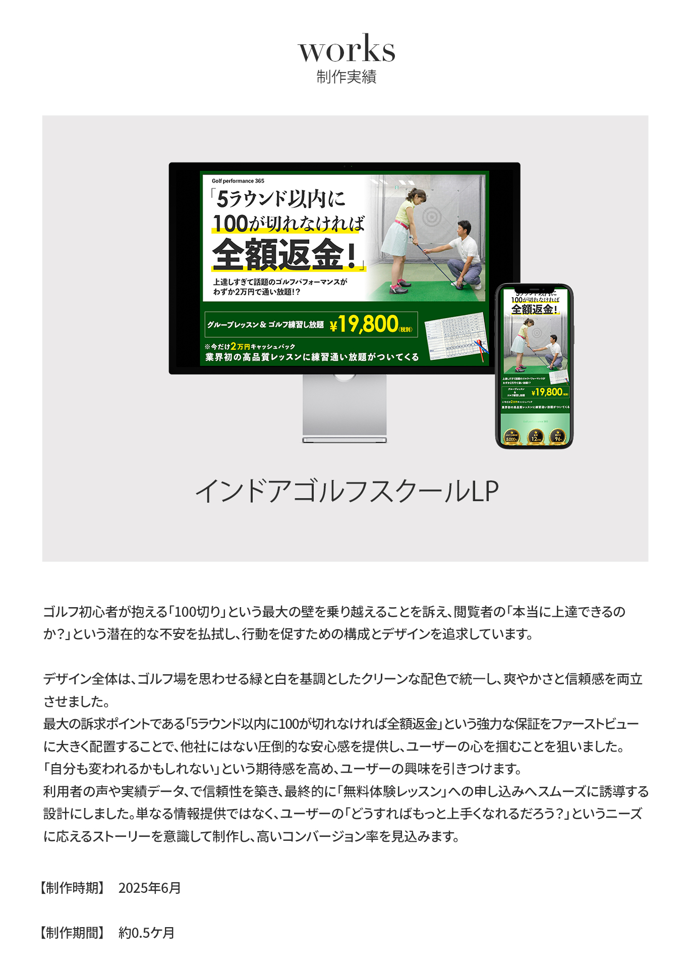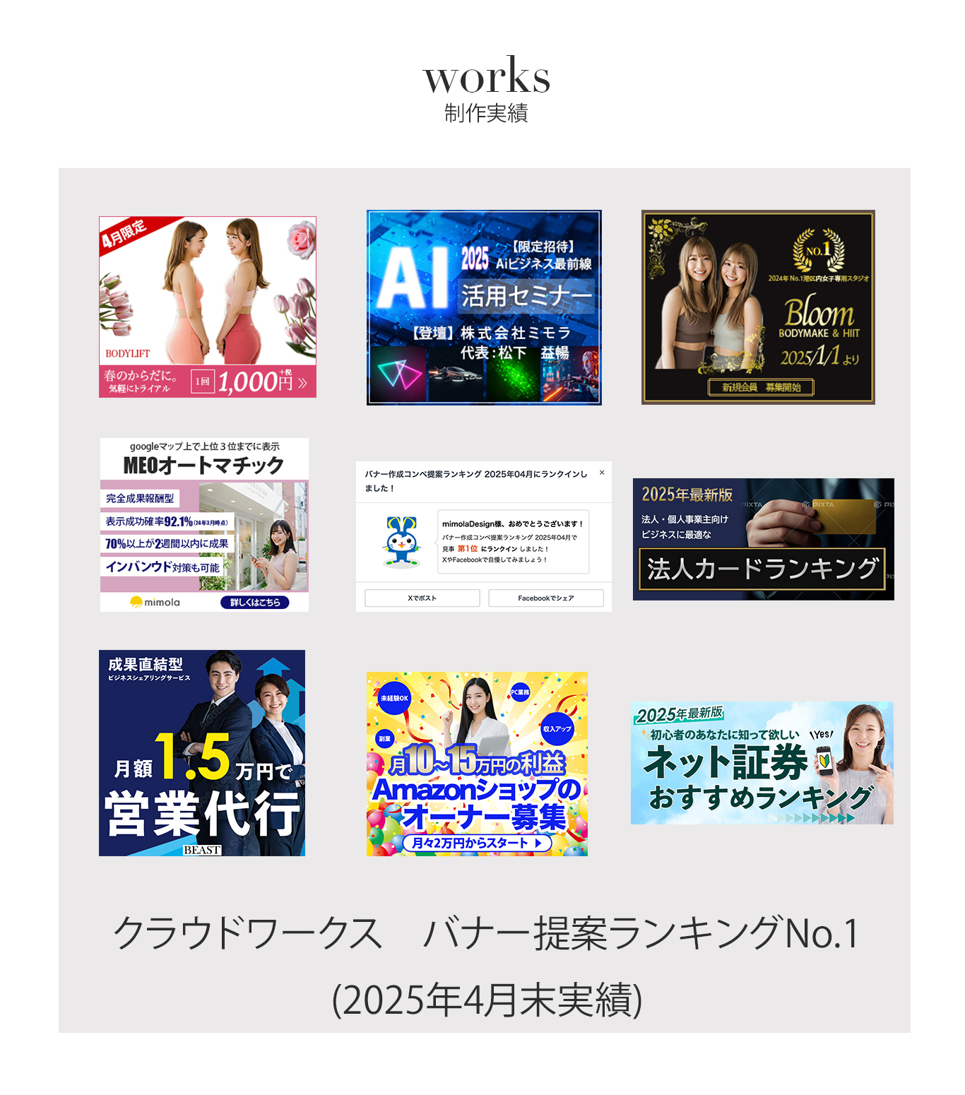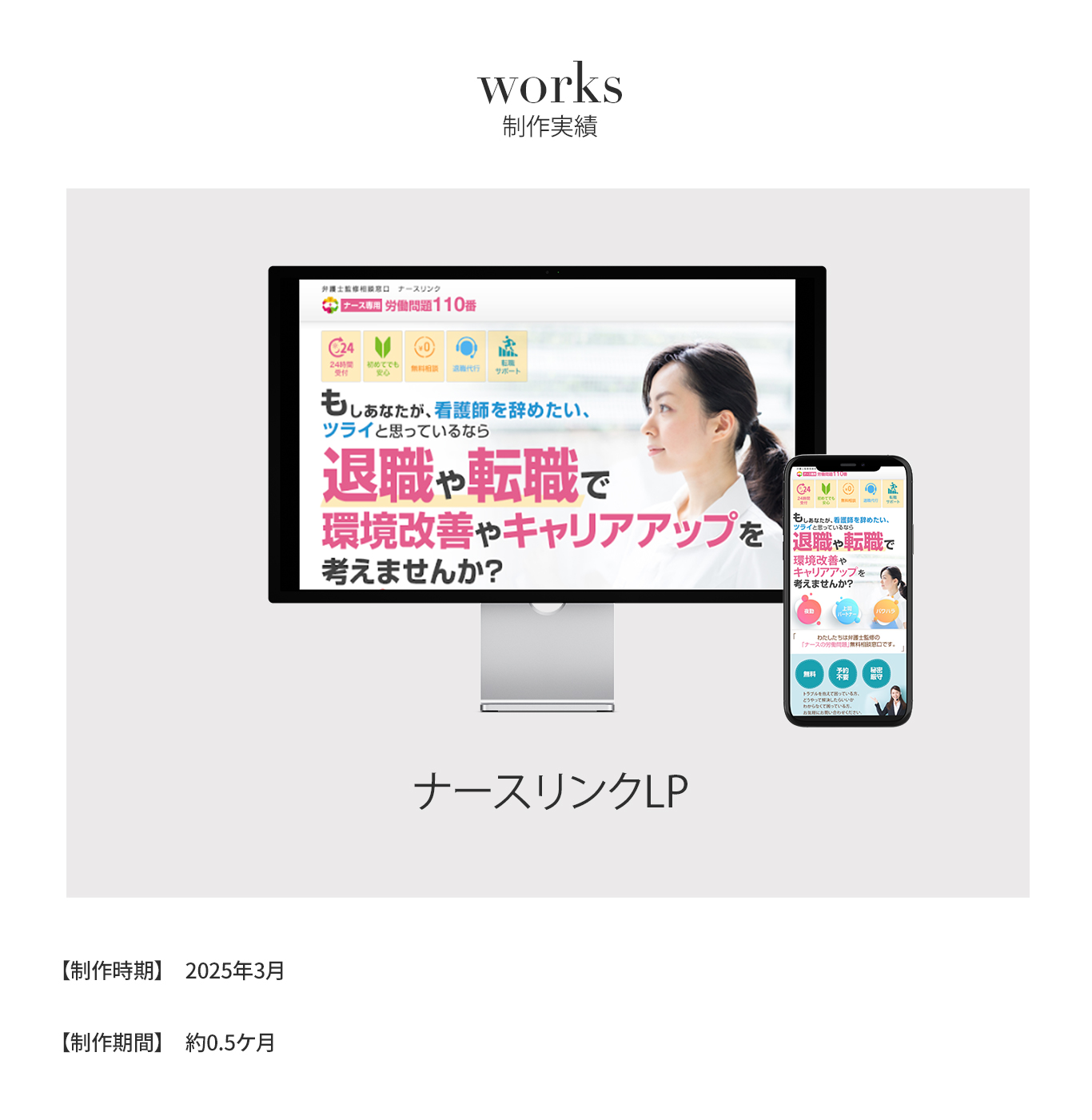グルーバル技術商社HP DX・AI活用推進企業HP WebデザインスクールLP 高級インソールLP インドアゴルフスクールLP ナースリンクLP 大手製薬会社HPアクセシビリティ対応 各種Webバナー広告 ロゴ・アパレルデザイン 一覧に戻る 一覧に戻る 一覧に戻る 一覧に戻る 一覧に戻る 一覧に戻る 一覧に戻る 一覧に戻る